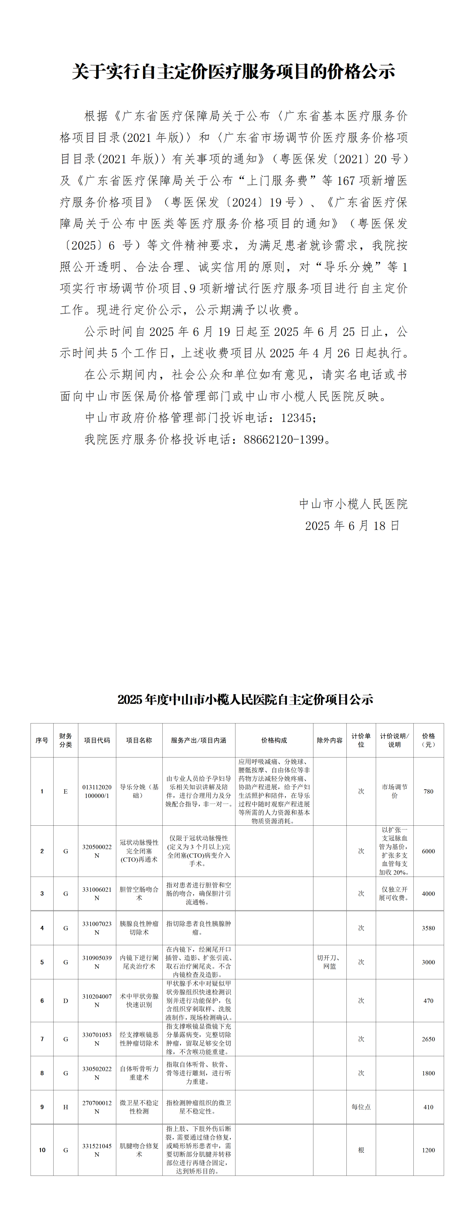 关于实行自主定价医疗服务项目的价格公示