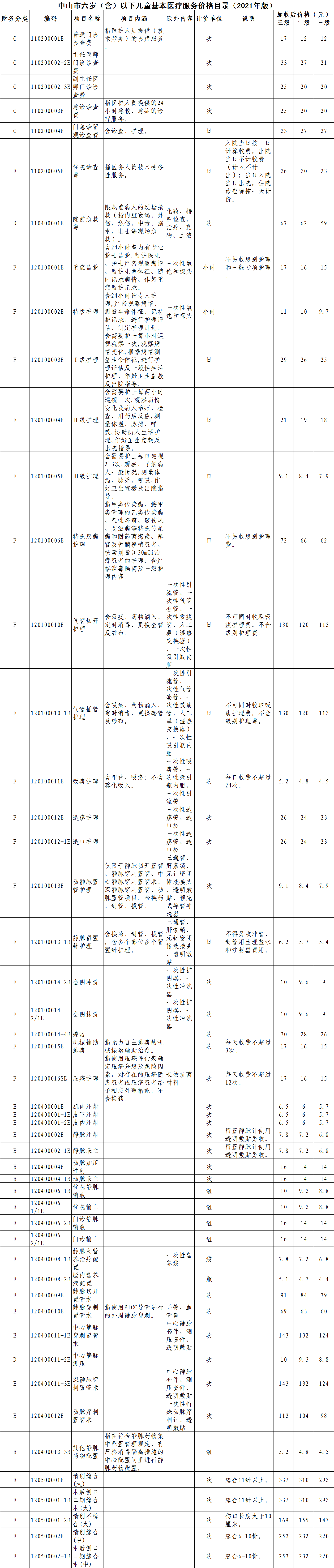 中山市六岁(含)以下儿童基本医疗服务价格目录(2021年版)