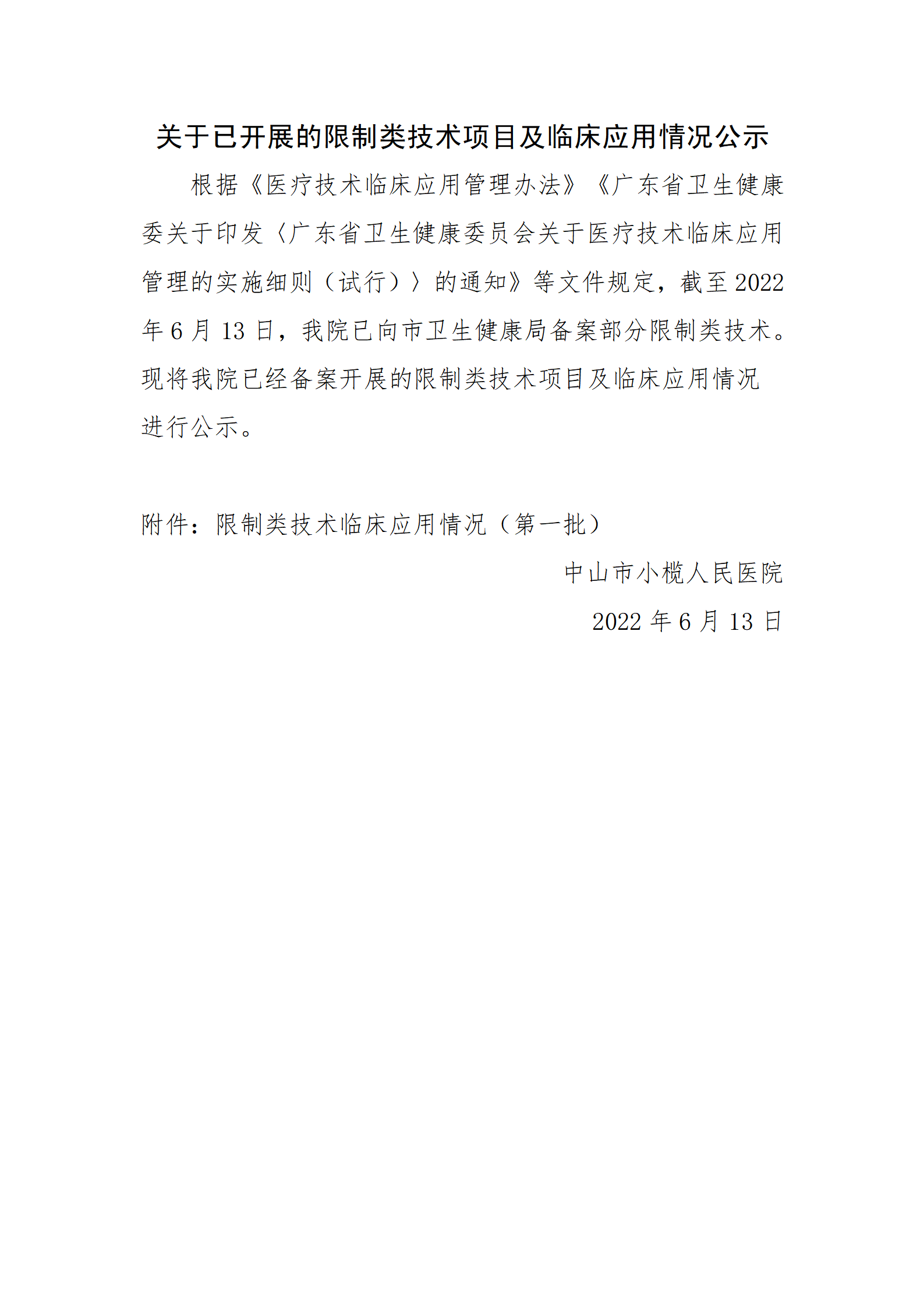 关于已开展的限制类技术项目及临床应用情况公示